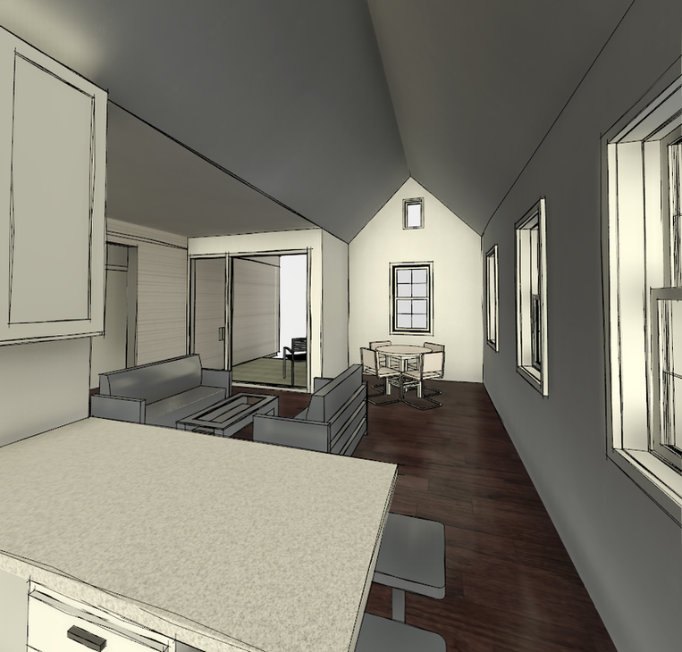 This contemporary interpretation of a traditional, Appalachian dogtrot house has been thoughtfully planned out to give everyone the individual space they need and great communal space for board games and parties. Big windows and high ceilings open up these spaces under dynamic vaulted ceilings.